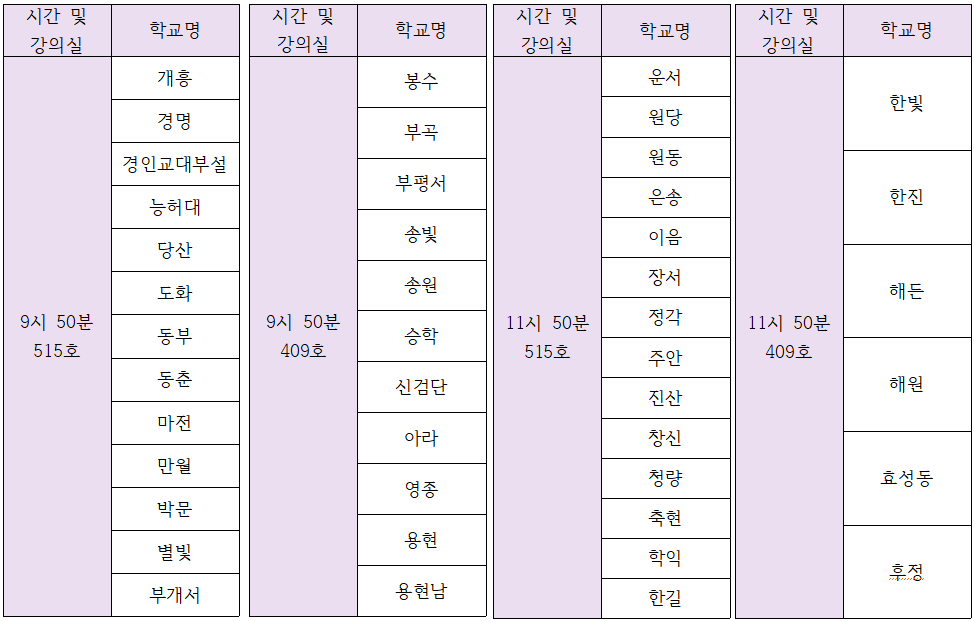 ** 시간은 '학교별 강의실 안내'를 참고해주세요.