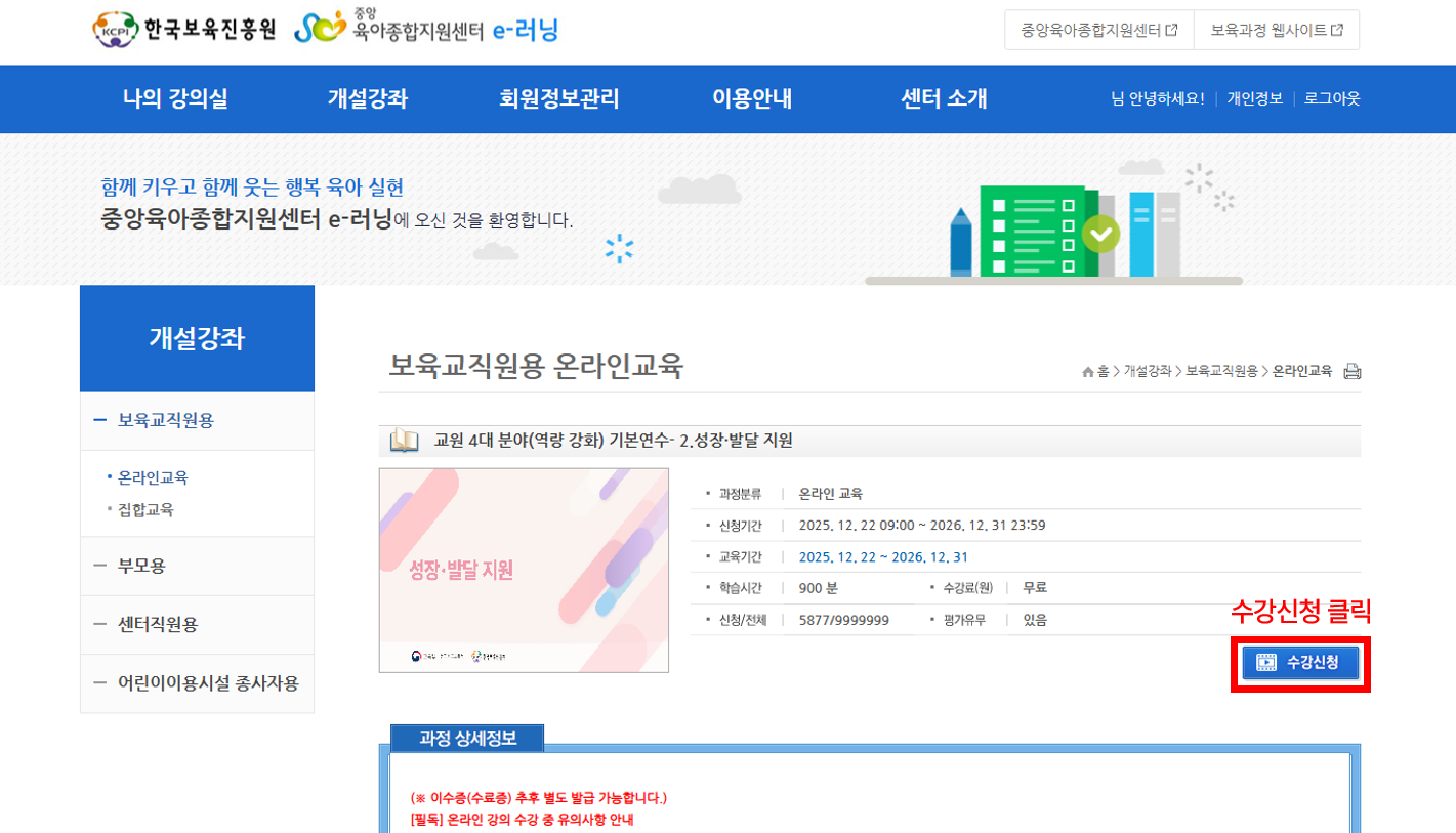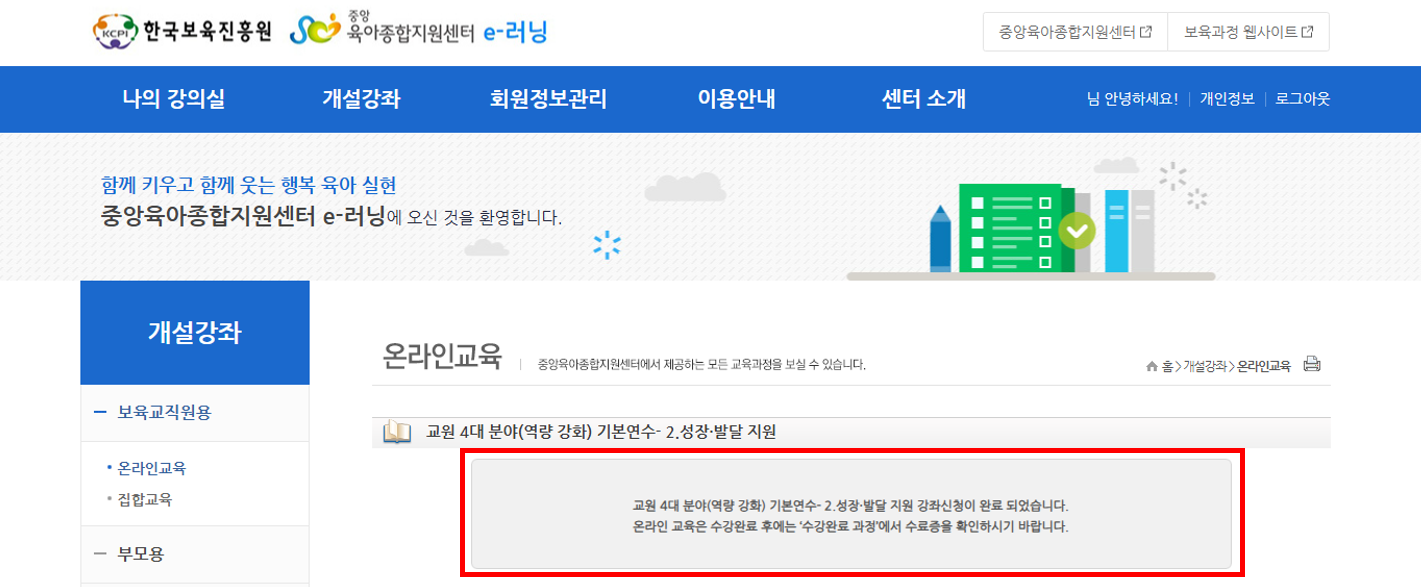 -> [한국보육진흥원] 교원 4대 분야(역량강화) 기본연수 2. 성장, 발달 지원: 15차시 / 보수교육 4시간 인정