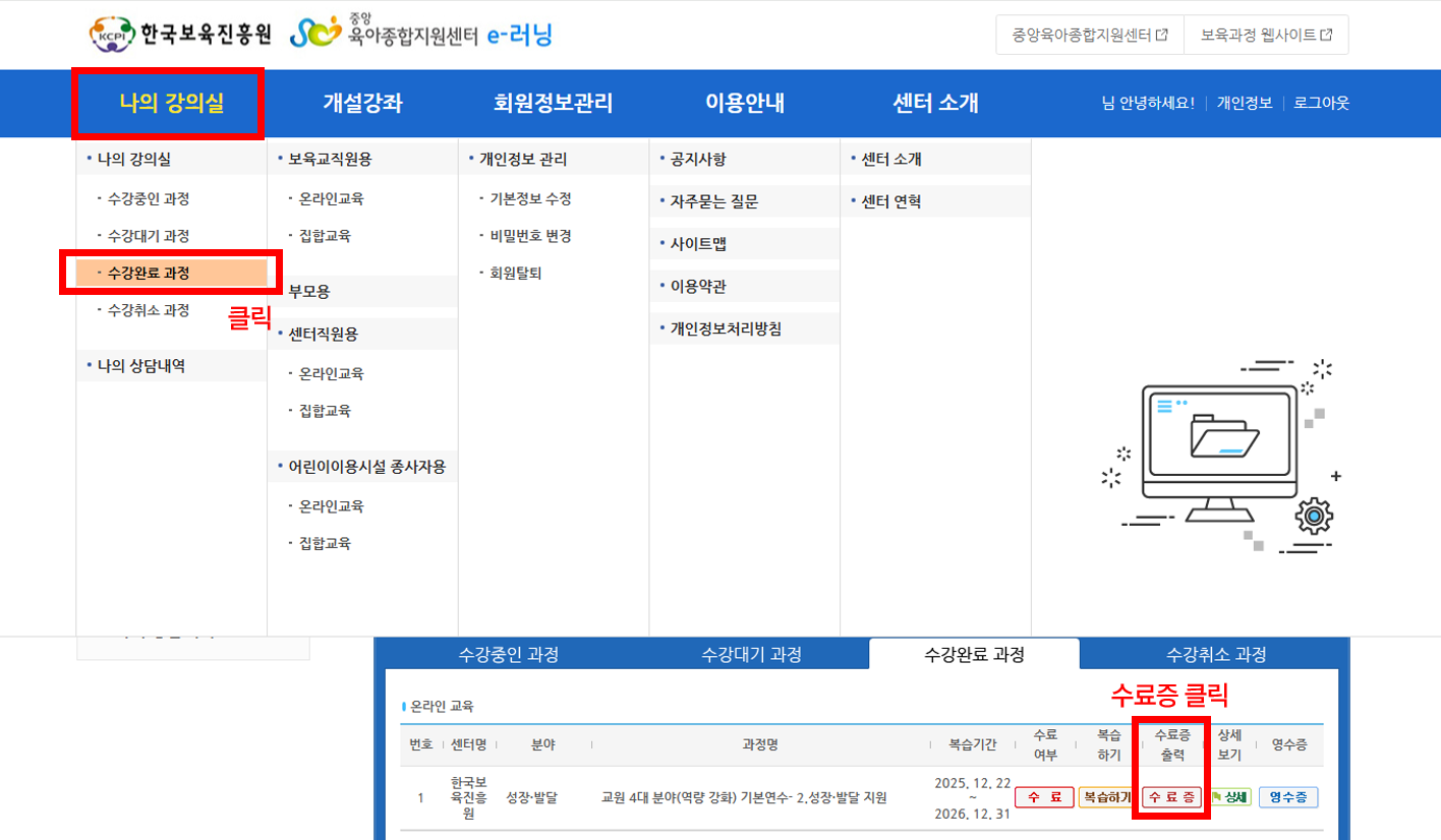 8. 상단 '나의 강의실' - '수강완료 과정' 클릭하여 강의실 입장 후 '수료증' 버튼 클릭