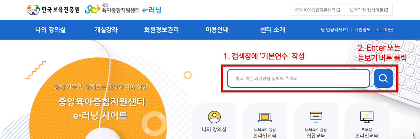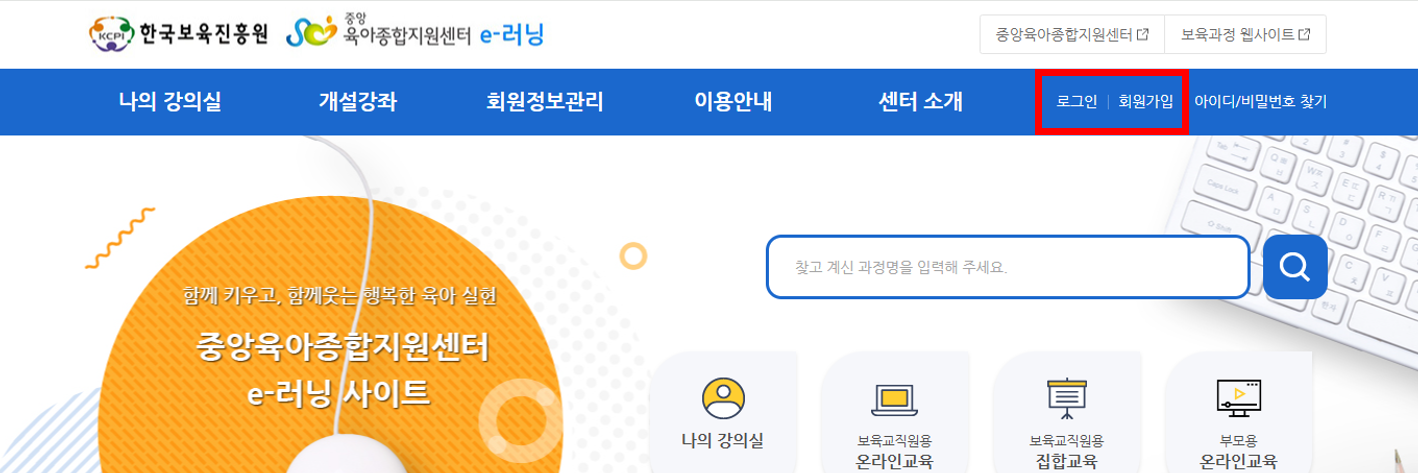 1. 한국보육진흥원 중앙e러닝 홈페이지에 회원가입 및 로그인