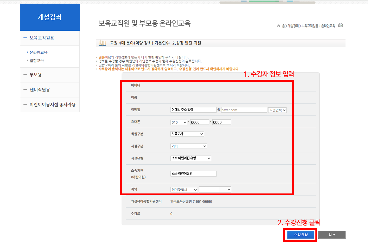 5. 수강자 정보를 올바르게 입력 후 하단의 '수강신청' 버튼 클릭