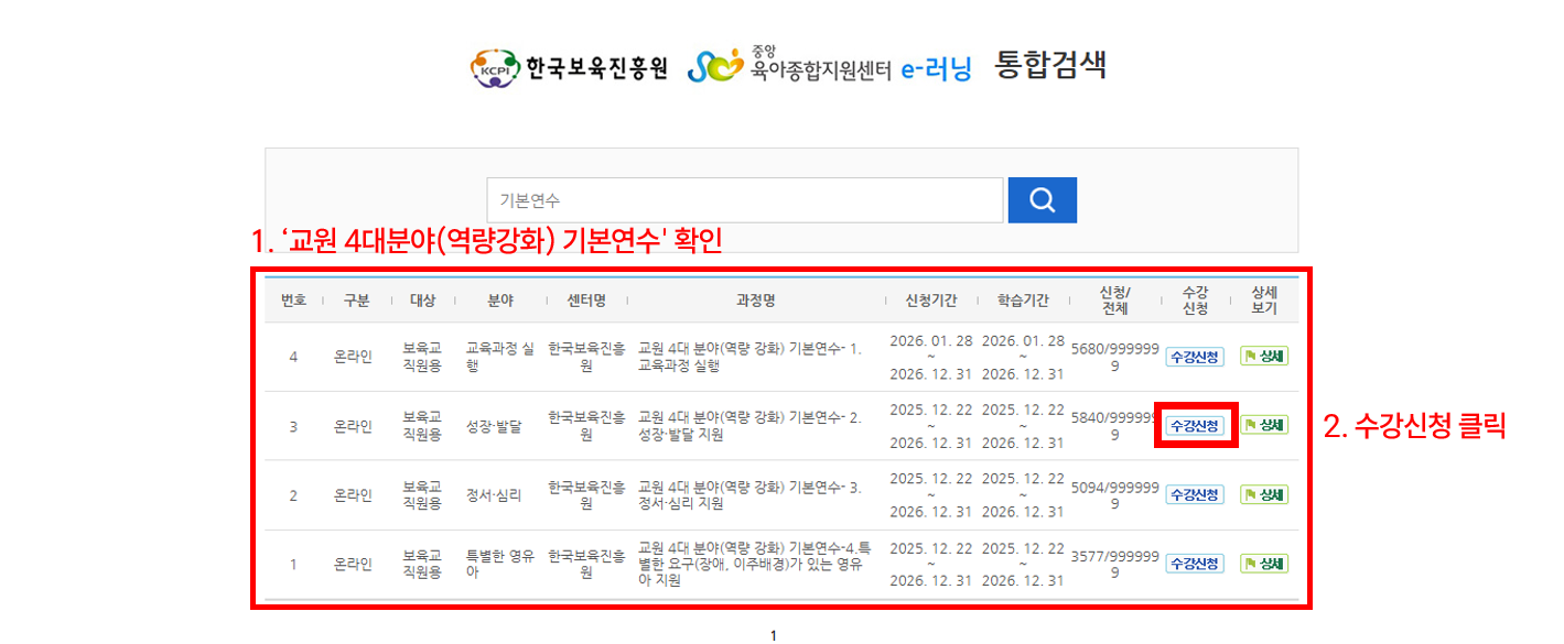 3. 교원 4대분야(역량강화) 기본연수 과목 확인 후 오른쪽의 '수강신청' 버튼 클릭
