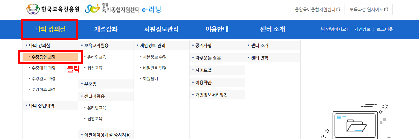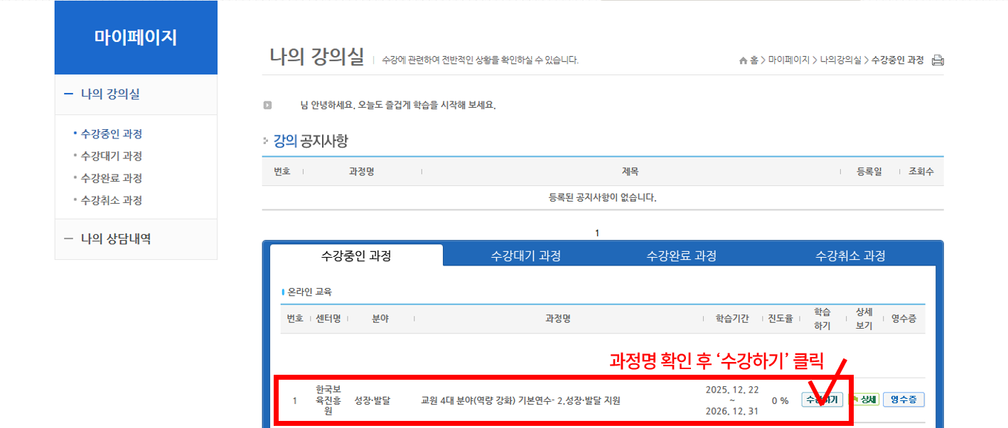 6. 상단 '나의 강의실' - '수강중인 과정'을 클릭하여 강의실 입장 후 '수강하기' 클릭하여 교육 수강