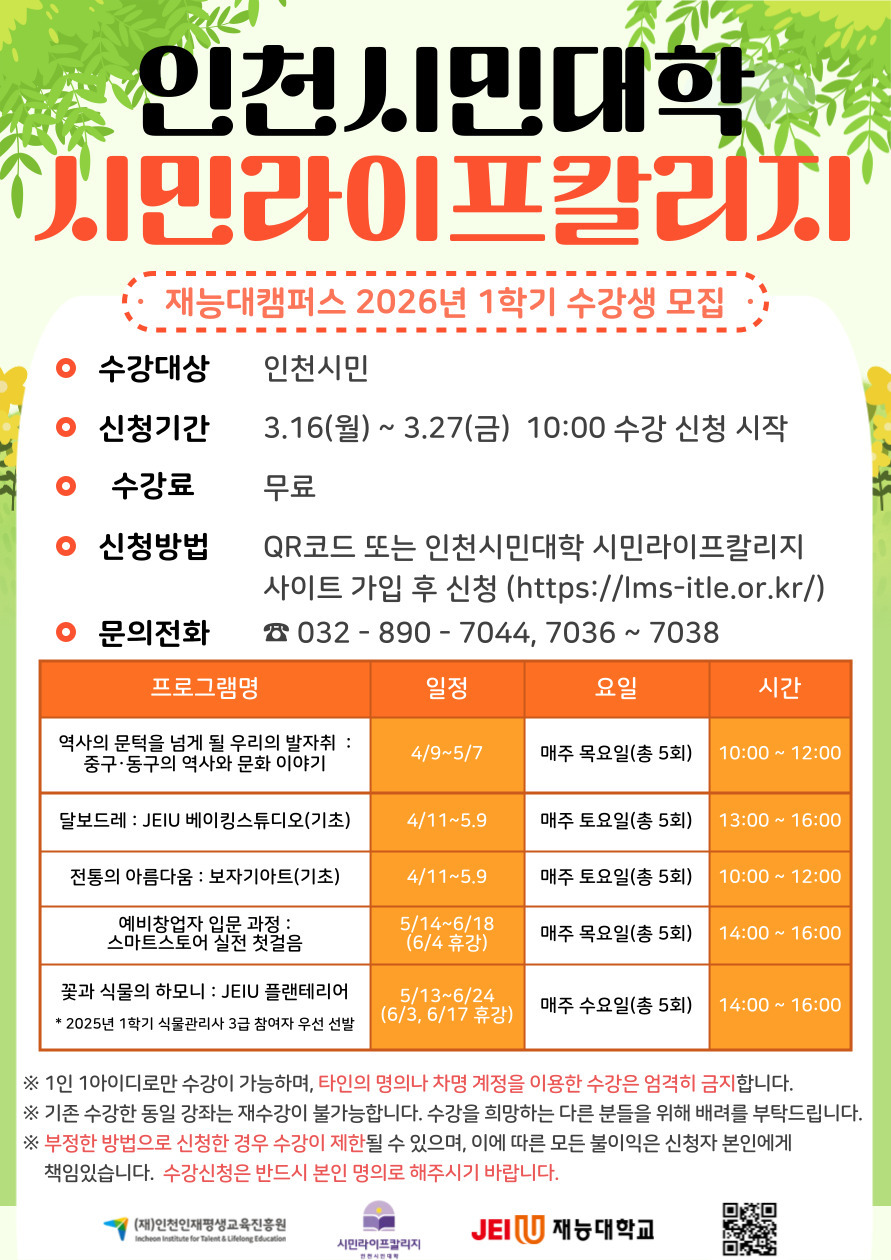 2026학년도 1학기 인천시민대학 시민라이프칼리지 재능대캠퍼스 수강생 모집