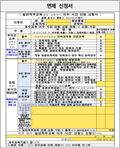 - 면제 과목당 면제 신청서 1개 (면제 신청서 1개로 아동학대, 안전교육 X)